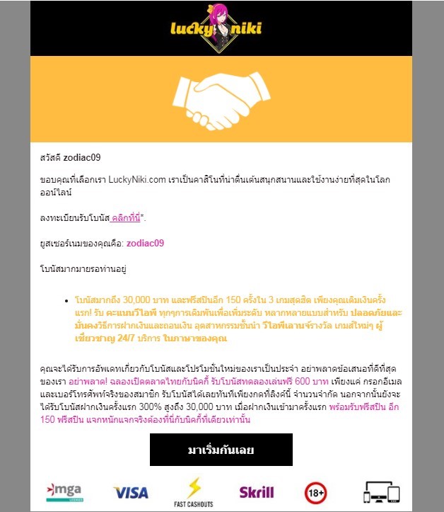 เมื่อลงทะเบียนเสร็จเรียบร้อยแล้ว คุณจะได้รับอีเมลสำหรับยืนยันทางอีเมลที่คุณลงทะเบียนเอาไว้ กรุณาตรวจสอบกล่องจดหมายขาเข้า และถังขยะ ภายในอีเมลของคุณ คุณจะพบกับลิงค์สำหรับการยืนยัน เมื่อคลิกที่ลิงค์ดังกล่าว คุณจะถูกส่งมายังเว็บไซต์ LuckyNiki หลังจากนั้น คุณจะสามารถเข้าสู่ระบบได้ โดยการกรอกชื่อผู้ใช้ และรหัสผ่านที่คุณได้กรอกข้อมูลไว้ตามแบบฟอร์มการสมัครสมาชิก
